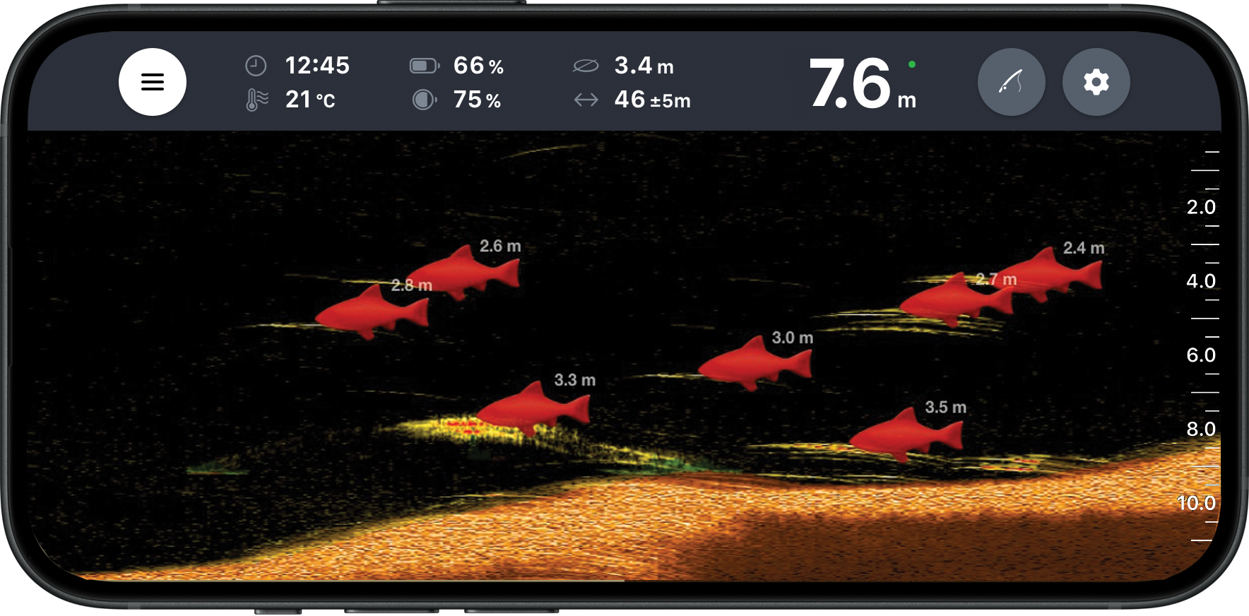 【120mの接続距離と100mのスキャン深度】 強力なWi-Fi接続により、最大120m先まで安定したデータ転送を実現。ソナーは水深100mまで正確にスキャンし、海底の地形や水温をリアルタイムで表示します。